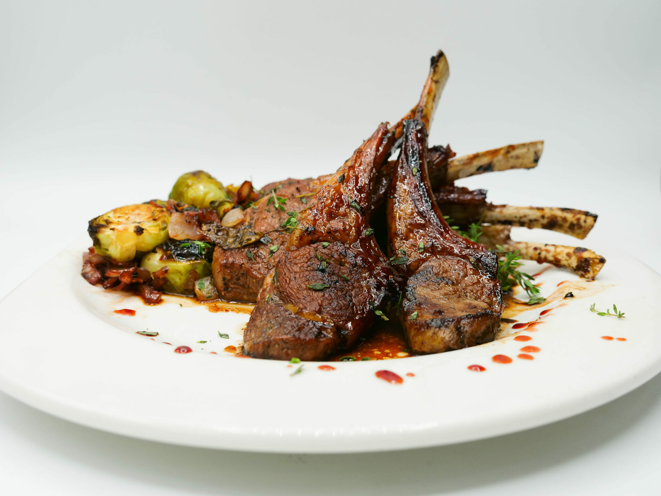 Portion approximately 1 cup of Brussels sprouts and 2 prepared lamb chops on each plate. Drizzle with an additional pomegranate mixture, if desired. Serve immediately.